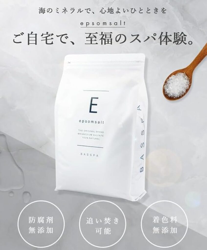 温浴効果を最大限に高めるため、入浴剤には硫酸マグネシウムを主成分とする『エプソムソルト』がおすすめです。